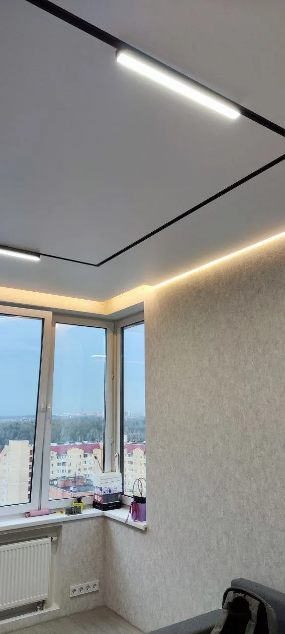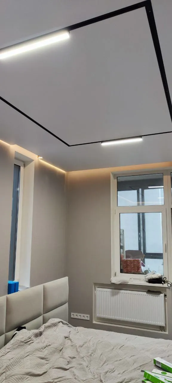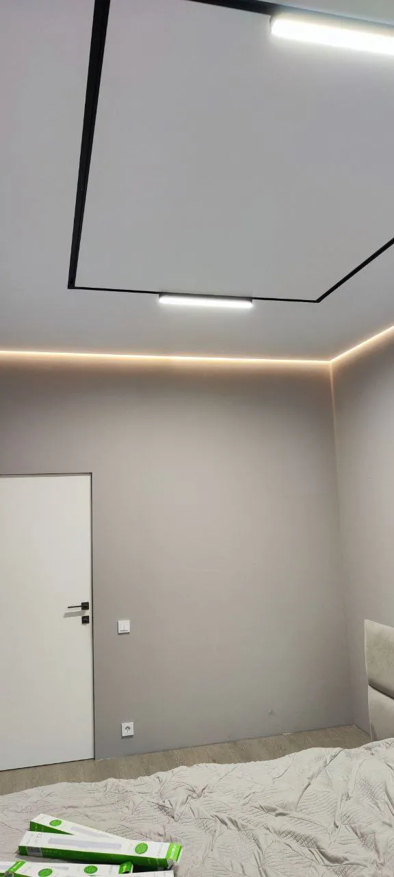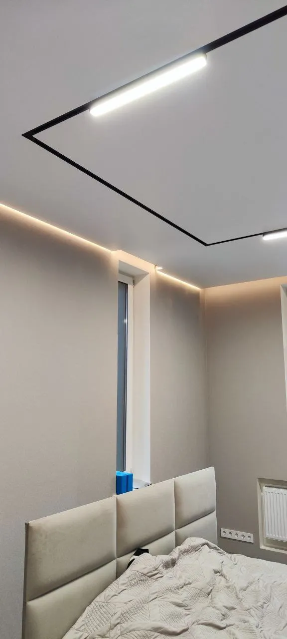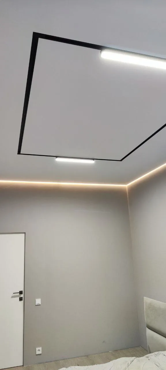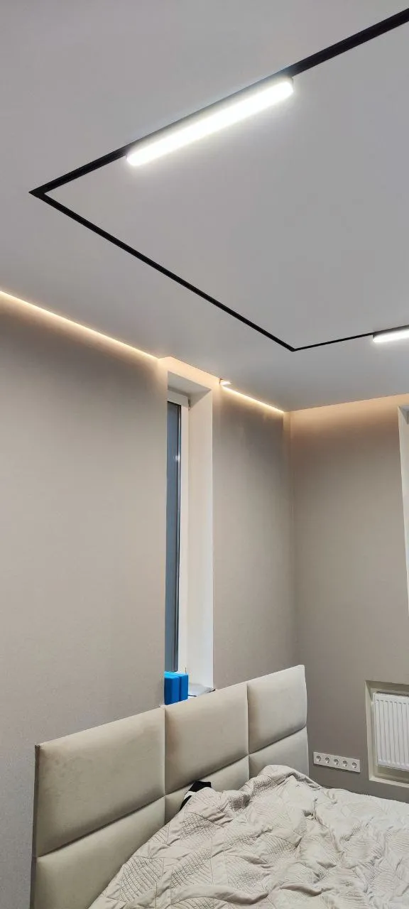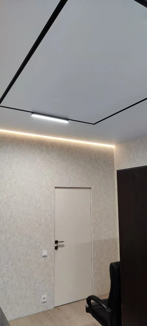 Сделали контурный натяжной потолок - выглядит круто. Рассматривали и теневой натяжной потолок, но в итоге выбрали контурном. Качество работы шикарное, потолок эффектный, интерьер сразу стал выглядеть дороже.
